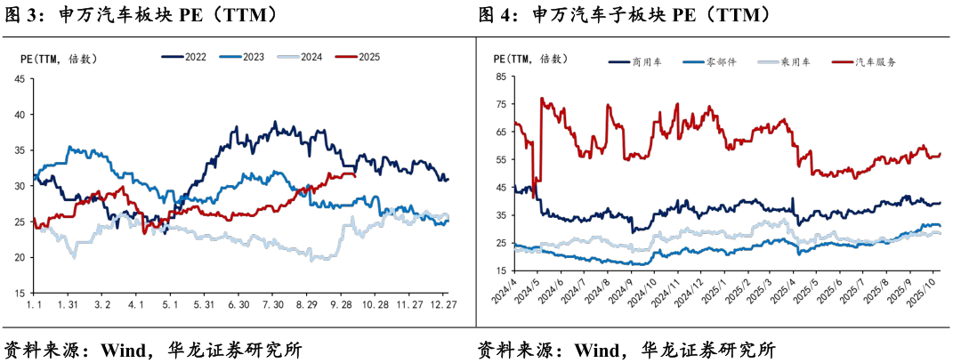 估值方面,截至2025年10月10日收盘,申万汽车板块PE为31.3倍,较上周环比下降。子板块中,乘用车/商用车/汽车零部件/汽车服务板块PE为28.4/39.5/31.1/57.0倍。