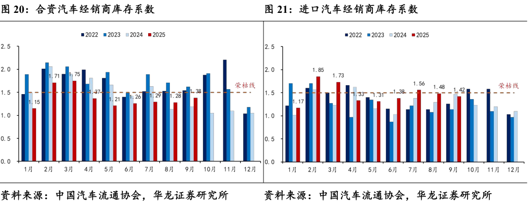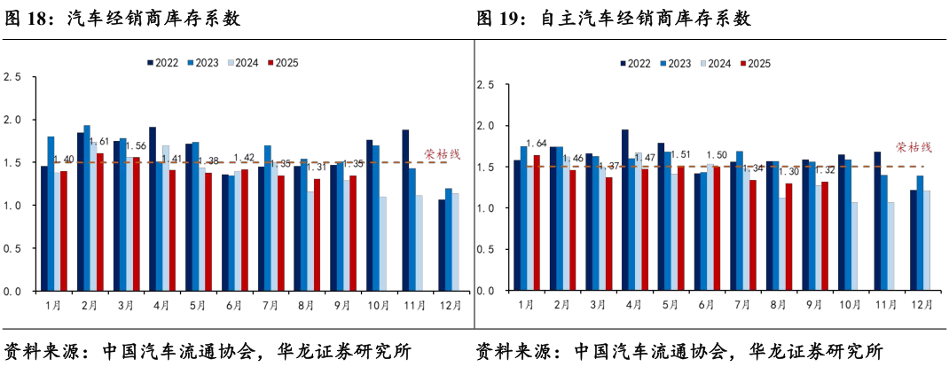 9月库存水平处于合理区间。据中国汽车流通协会数据,2025年9月份汽车经销商综合库存系数为1.35,同比+4.65%,环比+3.05%。其中自主品牌库存系数为1.32,同比+3.94%,环比+1.54%;合资品牌库存系数为1.38,同比+15.97%,环比+7.81%;进口品牌库存系数为1.42,同比-3.40%,环比-4.05%。