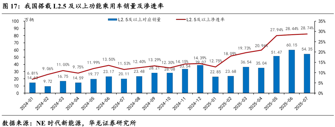 2025年7月L2.5及以上智驾渗透率达28.74%。据NE时代新能源数据,2025年7月搭载L2.5及以上智驾系统乘用车零售销量达54.35万辆,渗透率28.74%。2025年搭载L2.5及以上智驾系统乘用车累计销量284.08万辆,累计渗透率22.78%。随着传统自主车企等逐步将高速/城区NOA等高阶智驾功能下放至10万元级别车型,2025年L2.5及以上渗透率有望快速提升。