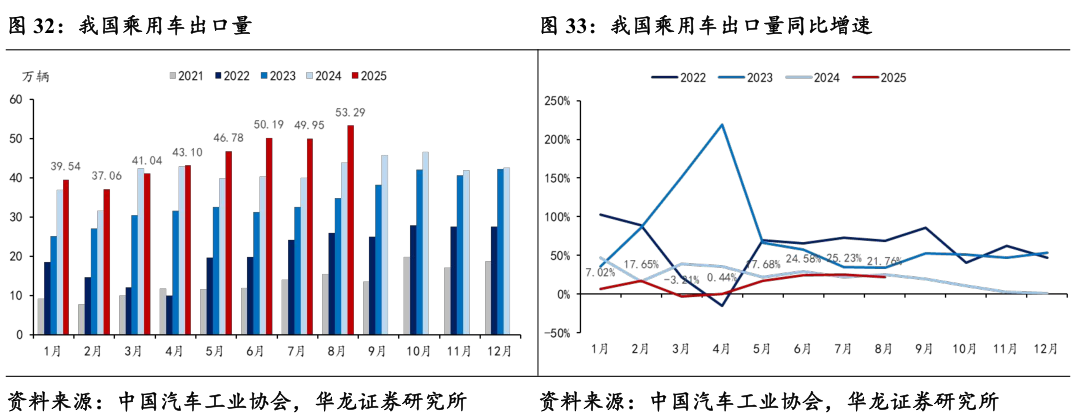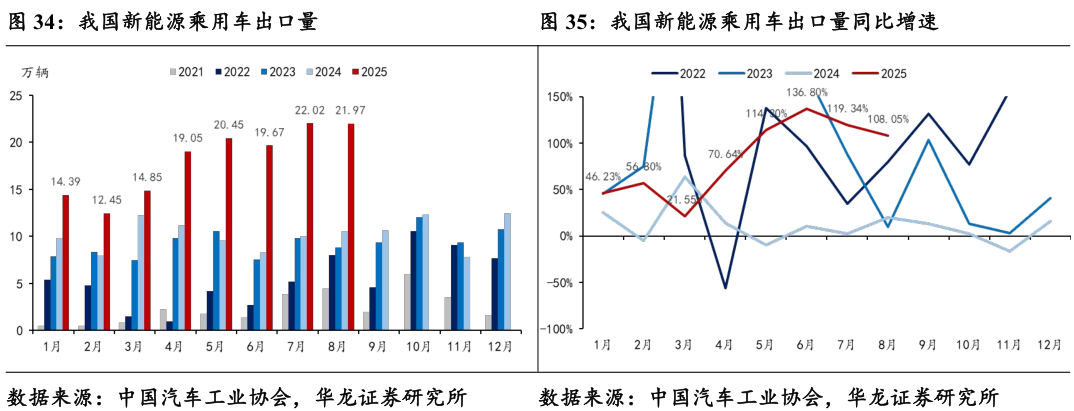 8月乘用车出口同比+21.76%。据中汽协数据,2025年8月乘用车出口销量完成53.29万辆,同比+21.76%,环比+6.70%。其中新能源乘用车出口销量完成21.97万辆,同比+108.05%,环比-0.22%。新能源乘用车出口增长的主要动力,一方面欧洲、东南亚和南美等市场对中国新能源乘用车,特别是插混车型接受程度提升,另一方面比亚迪、奇瑞和吉利等车企加大海外拓展力度,推动出口销量提升。