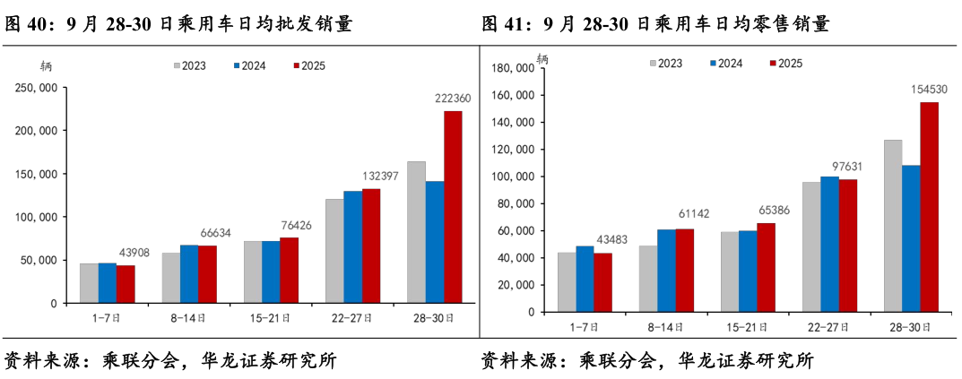 据乘联分会数据,9月28-30日,乘用车市场零售销量完成46.3万辆,同比+38%,较上月同期+7%;乘用车批发销量完成66.7万辆,同比+61%,较上月同期+1%。