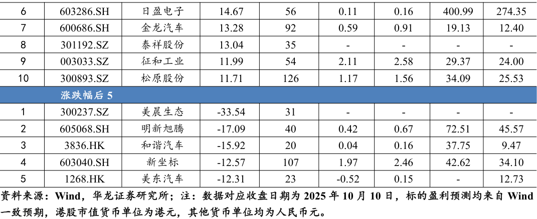 本周行情:申万汽车涨跌幅跑输沪深300指数1.04pct。2025年9月28日至10月10日,沪深300指数涨跌幅+1.47%,申万汽车板块涨跌幅+0.43%,其中乘用车/商用车/汽车零部件/汽车服务涨跌幅+1.76%/+2.95%/-0.09%/+2.41%。截至2025年10月10日,申万汽车板块PE(TTM)31.3倍,较上周环比下跌。