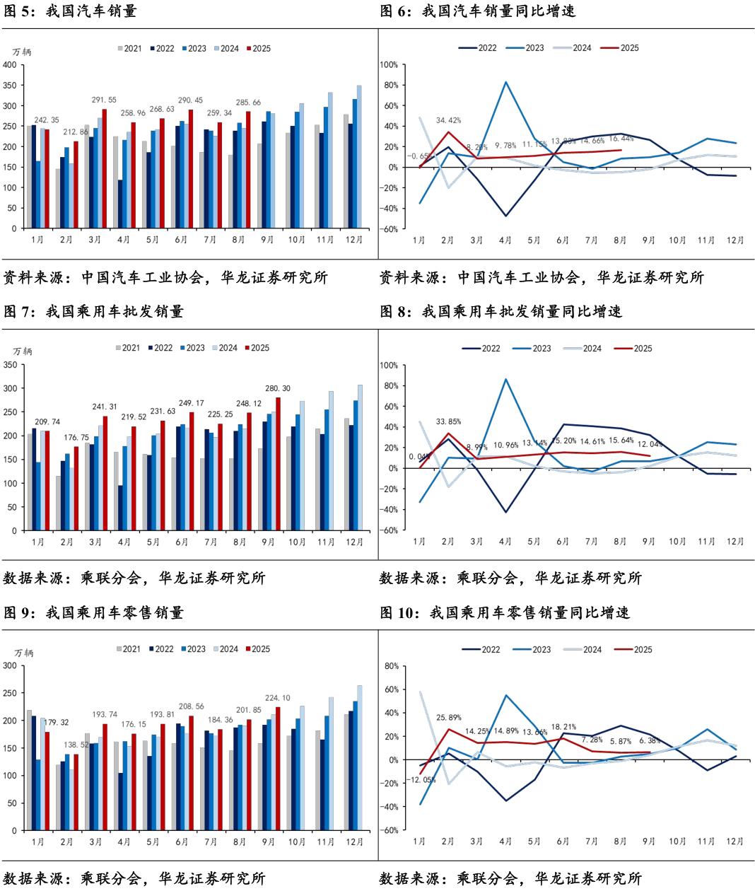 9月乘用车零售销量同比+6.38%。据中汽协数据,2025年8月,我国汽车销售完成285.66万辆,同比+16.44%,环比+10.15%。据乘联分会数据,2025年9月乘用车批发销量完成280.30万辆,同比+12.04%,环比+12.97%,乘用车零售销量完成224.10万辆,同比+6.38%,环比+11.02%。反内卷浪潮正推动车市向“降价减少、促销平缓”的方向转变,车市运行日益平稳。面对外部冲击加大、内部困难挑战叠加的复杂局面,强有力的对冲平衡措施支撑了上半年经济与车市。随着各省以旧换新补贴的政策差异化显现,区域间销量增速有所分化,部分区域的8月销量同比增长11%以上,而京津等区域下滑超10%,但9月的区域增速分化又有所改善。