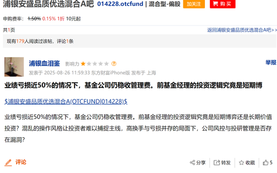 与惨淡业绩形成反差的是基金经理管理产品的异常高换手率。天天基金网数据显示,浦银安盛品质优选混合A的换手率在2022年4季度至2025年2季度持续高企,2022年4季度高达655.41%,2023年6月30日达619.66%,2023年12月31日为483.87%,2024年6月30日为480.55%,为2024年12月31日529.29%,2025年2季度高达496.98%,均远超行业平均水平。有基民跟帖表示,换手率这么高,到底是选股还是炒短线?