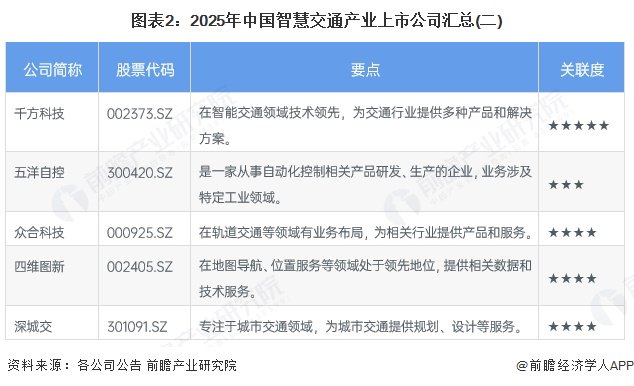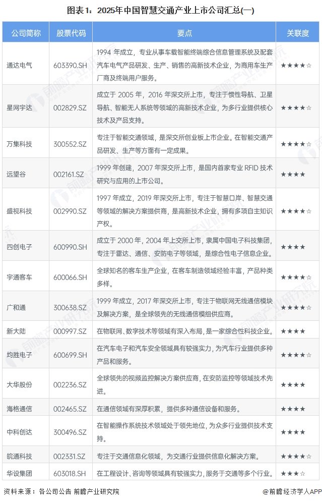 目前国内智慧交通题材的上市公司数量较多,这些上市公司涵盖智慧交通、汽车制造、物联网、安防等多领域,并在软硬件、技术集成和应用解决方案上形成了自身的特色。宇通客车是客车制造龙头,聚焦新能源客车研发;广和通为全球物联网无线通信模组领先企业,深耕车规级等领域;新大陆以支付技术为核心,布局物联网与智慧交通;大华股份是安防巨头,拓展智能交通监控;盛视科技专注智慧口岸与交通解决方案;均胜电子深耕汽车电子与安全系统;深城交聚焦城市交通规划与智慧化;中科创达提供智能操作系统技术;其余企业如皖通科技、千方科技等分别在交通信息化、智慧交通整体解决方案等领域发力。