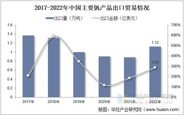 资料来源:中钢协钒业分会,华经产业研究院整理从我国主要钒产品出口贸易情况来看,近年来我国钒产品出口规模整体呈下降的趋势。2022年出口规模有所回升。据资料显示,2022年我国主要钒产品出口量为1.12万吨,同比增长27.3%;出口金额为2.86亿美元,同比增长54.6%。