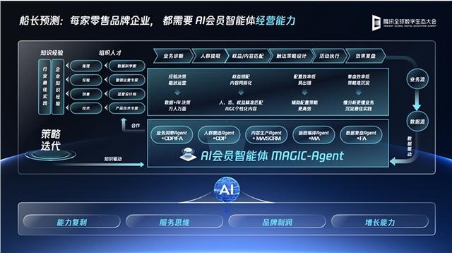 腾讯集团高级执行副总裁、云与智慧产业事业群CEO汤道生介绍“AI会员智能体”成果在当前社零增速下滑的宏观环境下,零售行业会员经营普遍有三大痛点:钱花了,听不见响;活动做了,留不下东西;信息发了,消费者不理你。除此之外,难以招到复合型人才,从策划到执行落地耗时长,关键环节易出错,人才流动率高,难以积累历史经验等问题,也构成会员经营的现实困局。零售连锁企业的GMV增长可被系统地拆解为门店数、单店消费用户、消费频次和笔单价四大支柱,而要驱动这些业绩增长,就必须在新客户转化、触达转化率、商品连带率等微观层面精细发力。