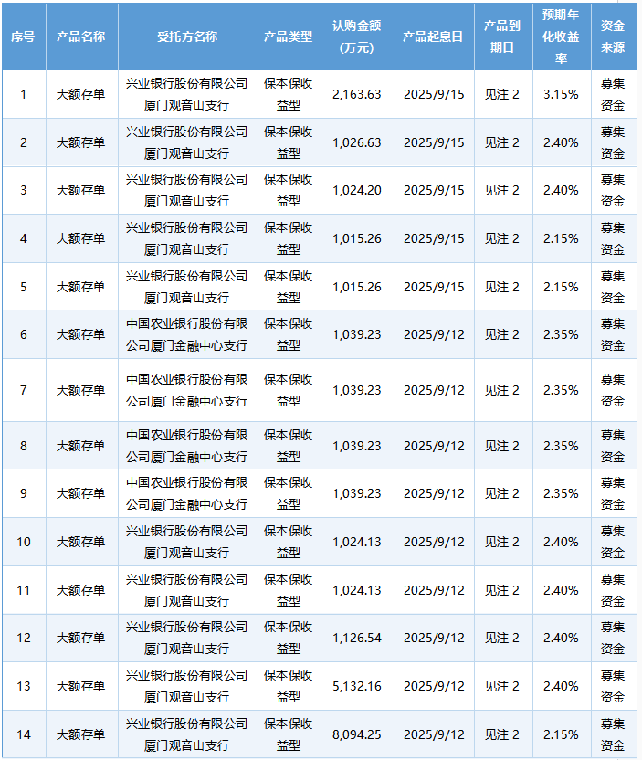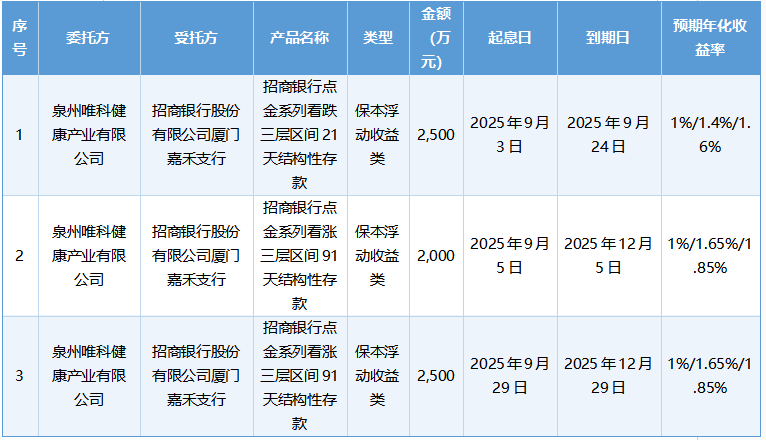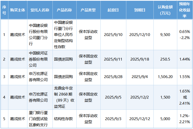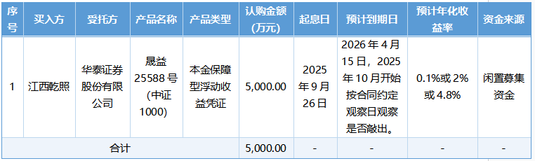 9月8日公告:公司近期买入一项本金保障型浮动收益凭证,金额为10,500.00万元,起息日为2025年9月8日,预计到期日为2026年4月9日,年化收益率为0.1%或1.8%或4.69%,资金来源为闲置募集资金。