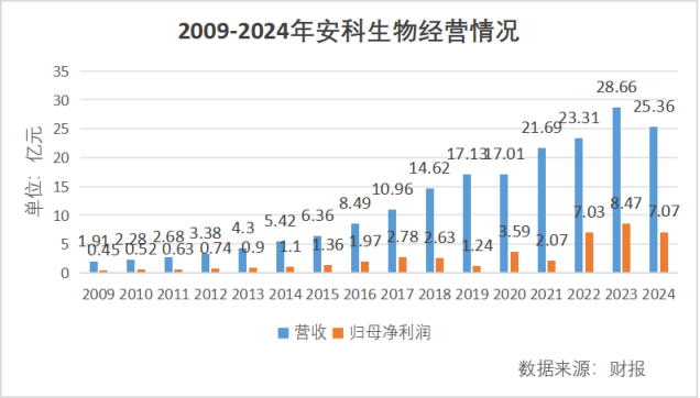 只是在第31年的关口,挑战还是来了:年报数据显示,2024年安科生物实现营收25.36亿元,归母净利润7.07亿元,同比分别下降11.51%与16.56%;直到2025年中报,营收12.92亿元、归母净利润3.67亿元,同比下滑0.51%与11.92%的结果,都在加重“难得”的危险性。