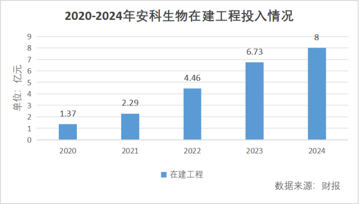 年报数据显示,2020年安科生物的在建项目投入为1.37亿元,此后逐年提升,到2024年已经增长至8亿元,CAGR达到55.45%。