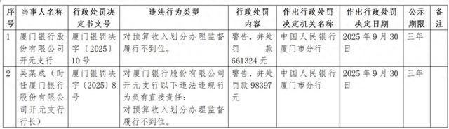 厦门银行股份有限公司开元支行因对预算收入划分办理监督履行不到位,被警告,并处罚款661324元。同时,时任厦门银行开元支行行长的吴某成因对厦门银行股份有限公司开元支行以下违法违规行为负有直接责任:对预算收入划分办理监督履行不到位,被警告,并处罚款98397元。