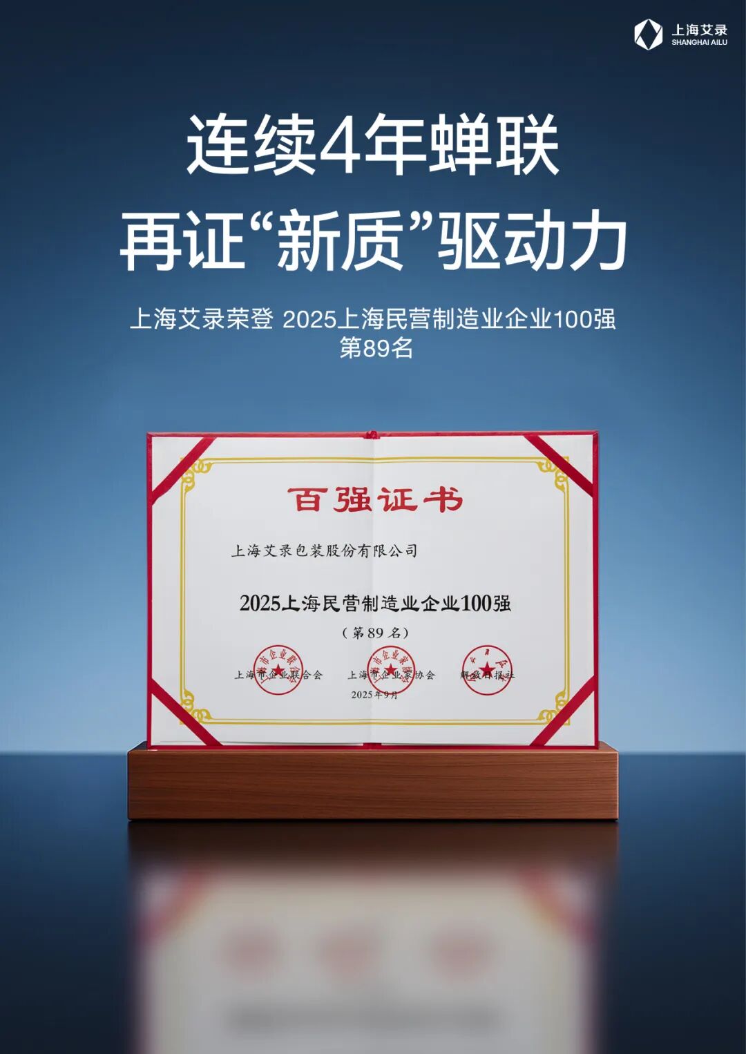 上海艾录连续第四年荣登“上海民营制造业企业100强”,位列第89名,展现稳健实力与持续成长力。