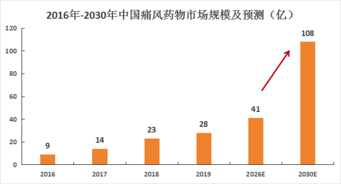 数据显示,2023年我国成人高尿酸血症患病率已达14.0%,痛风患病率约在1%-3%,并呈逐年上升趋势。据测算到2030年,我高尿酸血症以及痛风患病人数将会达2.4亿,相应的市场规模也将提升至约108亿。