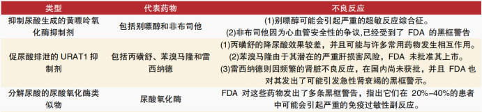 可以上三类药品均有较为明显的临床缺陷,比如别嘌醇存在超敏反应、非布司他存在引起患者心血管风险、苯溴马隆和雷西纳德则分别存在肝、肾损害风险。