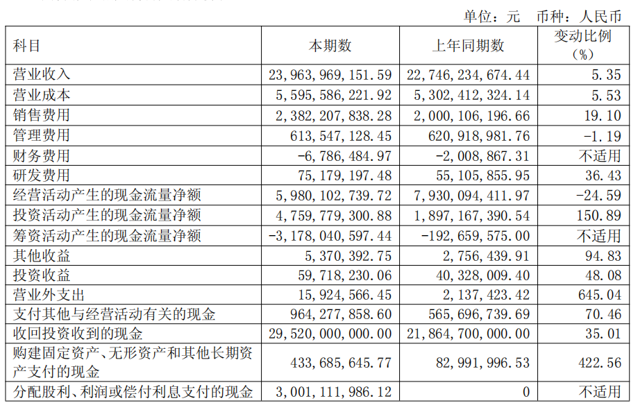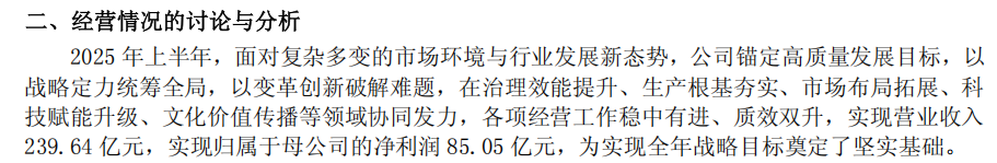 2025年8月28日山西汾酒公布了2025年半年度经营业绩:营收239.64亿同比增长5.35%,净利润85.05亿同比增长1.13%,