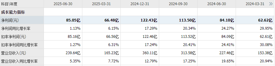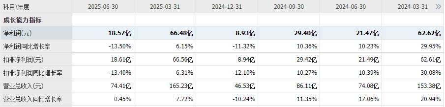 其中第二季度营收74.41亿同比小幅增长0.45%,净利润18.57亿同比下降13.5%;