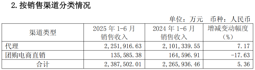代理渠道营收225.2亿同比增长7.17%,团购电商直销13.6亿同比下降17.63%;