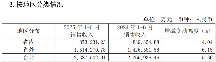 省内营收87.3亿同比增长4.04%,省外营收151亿同比增长6.15%。