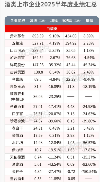 今年中报营收、净利润保持增长的仅有茅台、五粮液、山西汾酒、古井贡酒、老白干酒、金微酒。