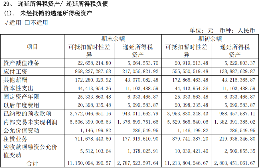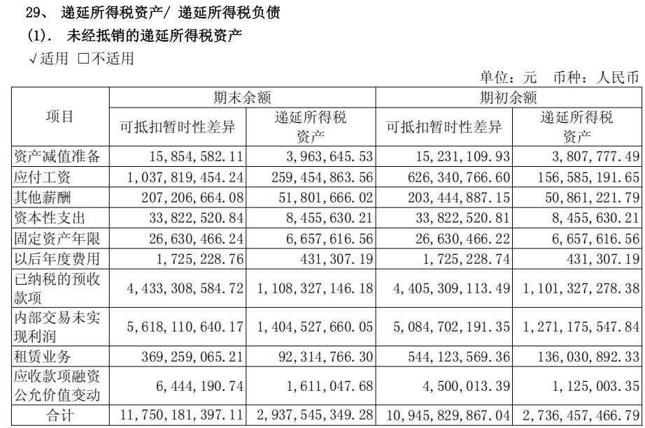 2025年中报公司内部交易未实现利润56.2亿,为此确认14.04亿递延所得税资产:内部交易未实现利润56.2亿×企业所得税税率25%=14.04亿递延所得税资产。