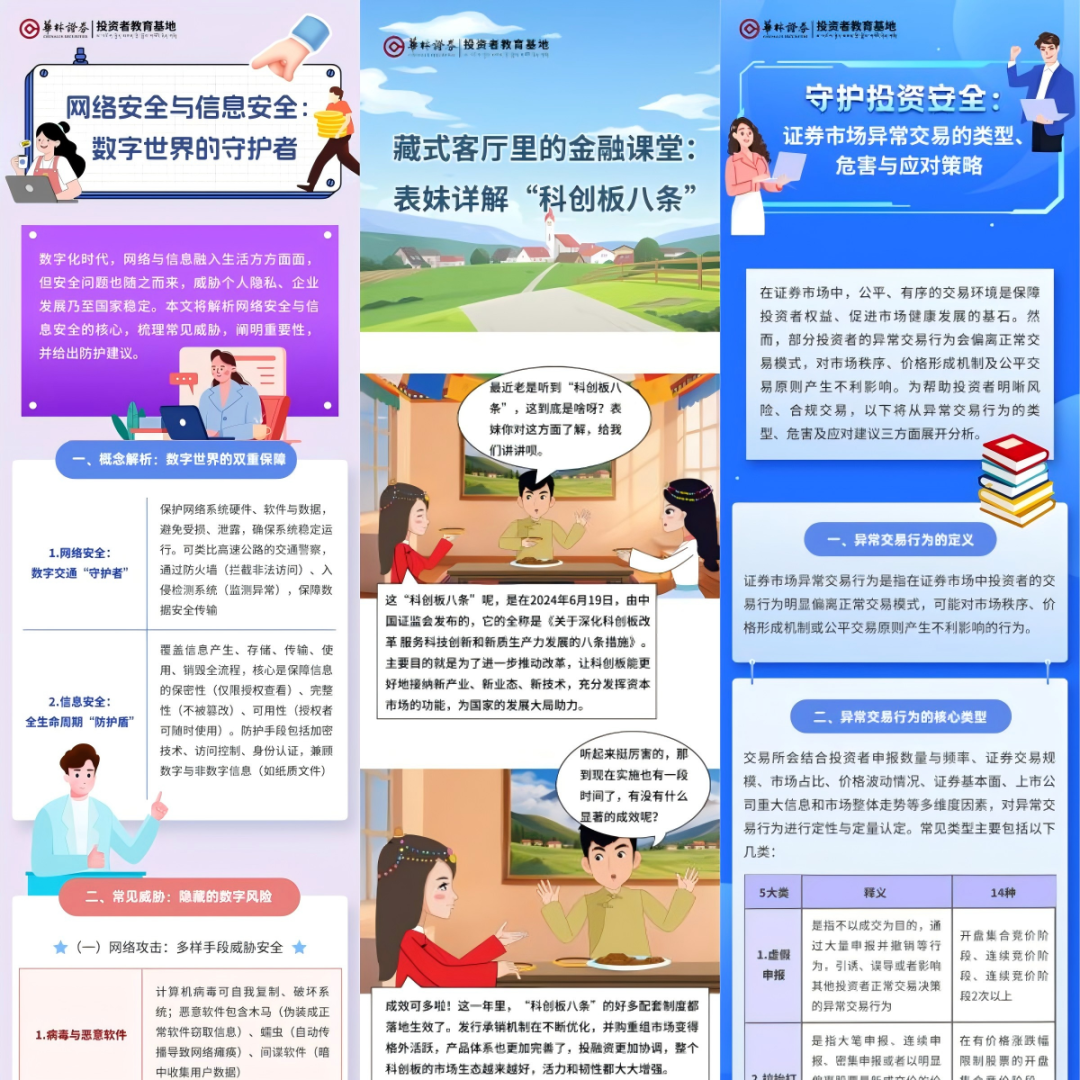 2025年9月,在西藏局和三所统筹指导下,华林证券投教基地投资者教育基地为深入贯彻中央金融工作会议精神,落实资本市场新“国九条”及相关要求,组织开展了以“保障金融权益 助力美好生活”、“统一大市场 公平竞未来”等为主题的活动,旨在提高投资者对金融市场的认识和理解,增强其风险防范意识和自我保护能力。活动期间,华林证券投教基地充分发挥自有渠道和特色资源优势,通过创新投教模式和丰富活动形式,为学生群体、乡村居民、广大投资者提供精准化、差异化的金融教育服务。引导投资者树立正确的投资理念,理性看待投资收益和风险,避免盲目跟风和投机行为。