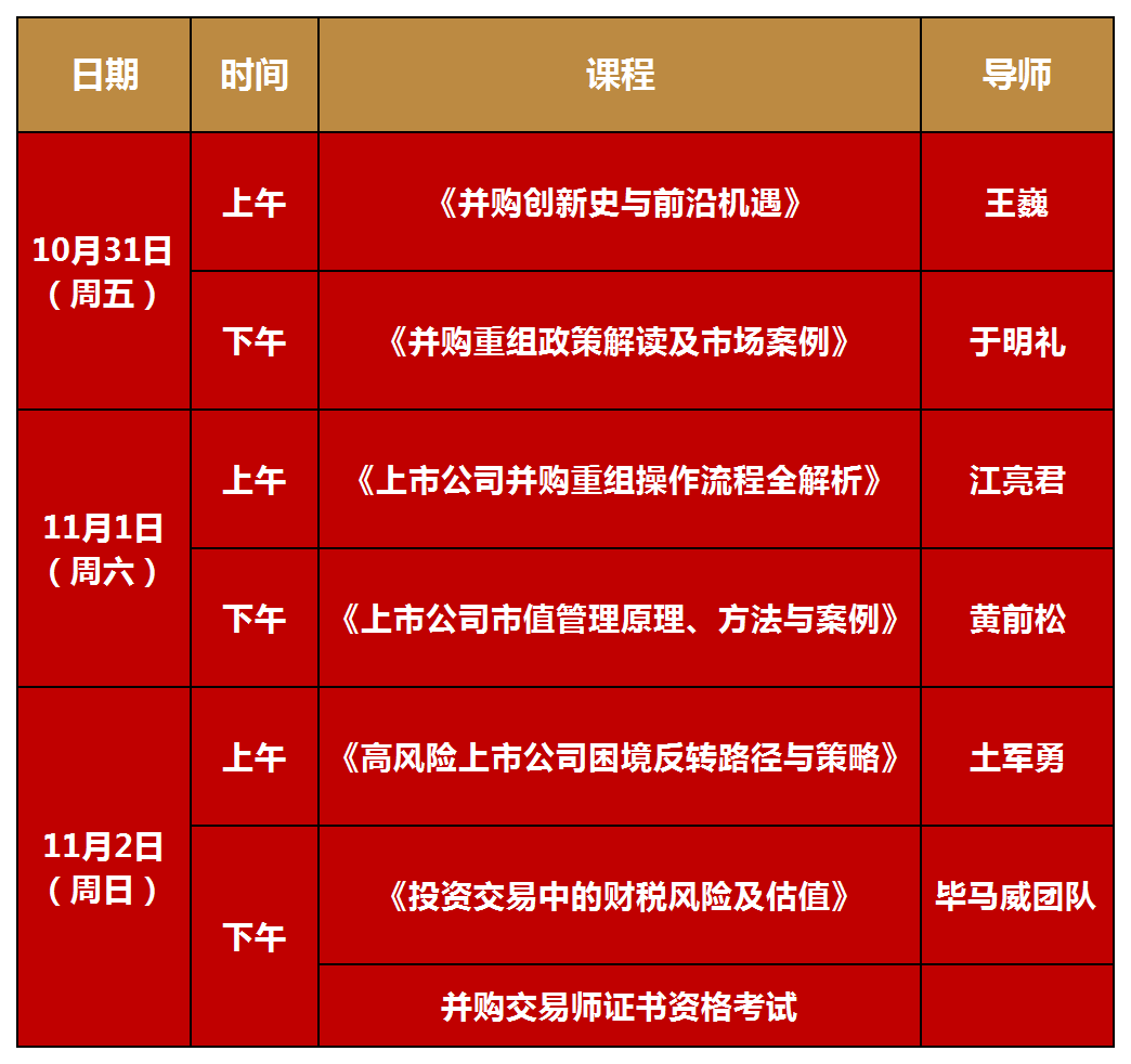 兹定于2025年10月31-11月2日(共三天)北京举办并购交易专题研修班。本次课程紧扣政策导向与市场需求,以培养具备国际视野、扎实专业素养及实战操作能力的并购人才为核心目标,助力学员在并购重组全流程中有效识别风险、精准捕捉机遇,为企业高质量发展注入智力动能。
