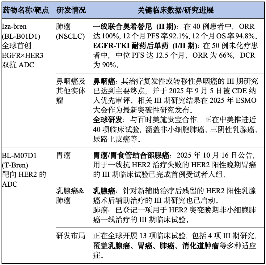 其中百利天恒的Iza-bren (BL-B01D1)作为全球首个进入III期临床的EGFRxHER3双抗ADC,其在非小细胞肺癌、乳腺癌、卵巢癌等多个实体瘤中展示了令人鼓舞的疗效和可控的安全性。这获得了FDA的突破性疗法认定,并与BMS达成全球合作,是中国创新“出海”的标杆;BL-M07D1:作为一款具有“同类最佳”潜力的HER2 ADC,其在乳腺癌和胃癌中的数据也入选了本次大会的展示。