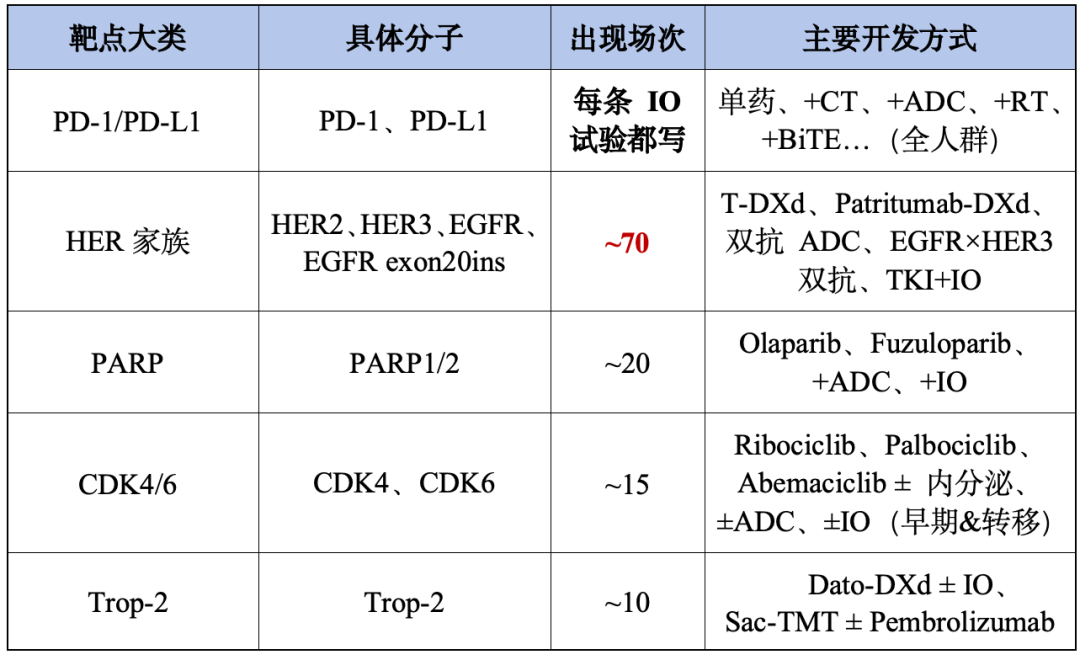 其中“ADC + IO”与“双抗/多抗”是2025年最显眼的联合主线,且每个靶点至少对应1种组合策略——单药获批只是起点,联合才是终局。