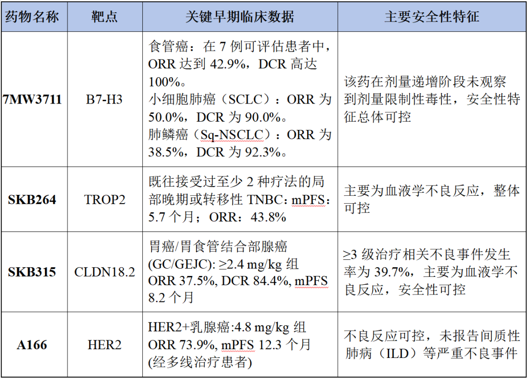 7MW3711 (迈威生物,靶向B7-H3的ADC)、TQB2102(中国生物制药,靶向HER2的ADC)、SKB315 (科伦博泰,靶向CLDN18.2的ADC)、SKB264(科伦博泰,靶向TROP-2的ADC)、A166(科伦博泰,靶向HER2的ADC)、BL-B01D1(百利天恒,EGFRxHER3双抗ADC)等,在Mini Oral或Proffered Paper环节公布临床试验数据,展示了良好的疗效和安全性。