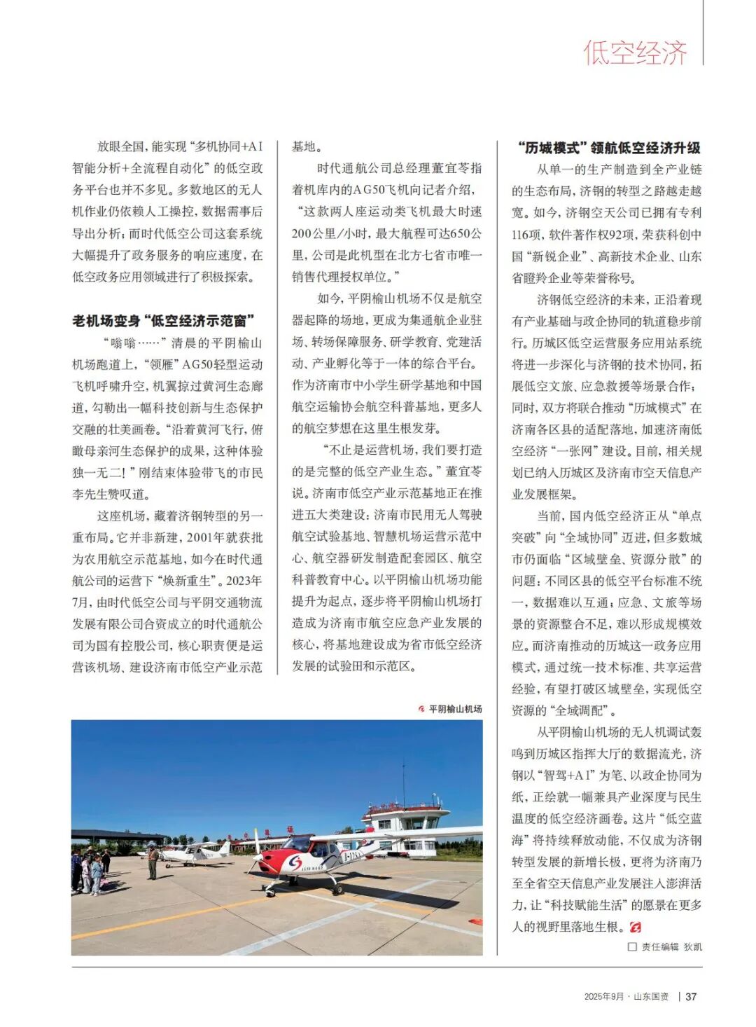 从平阴榆山机场的无人机调试轰鸣到历城区指挥大厅的数据流光,济钢以“智驾+AI”为笔、以政企协同为纸,正绘就一幅兼具产业深度与民生温度的低空经济画卷。这片“低空蓝海”将持续释放动能,不仅成为济钢转型发展的新增长极,更将为济南乃至全省空天信息产业发展注入澎湃活力,让“科技赋能生活”的愿景在更多人的视野里落地生根。