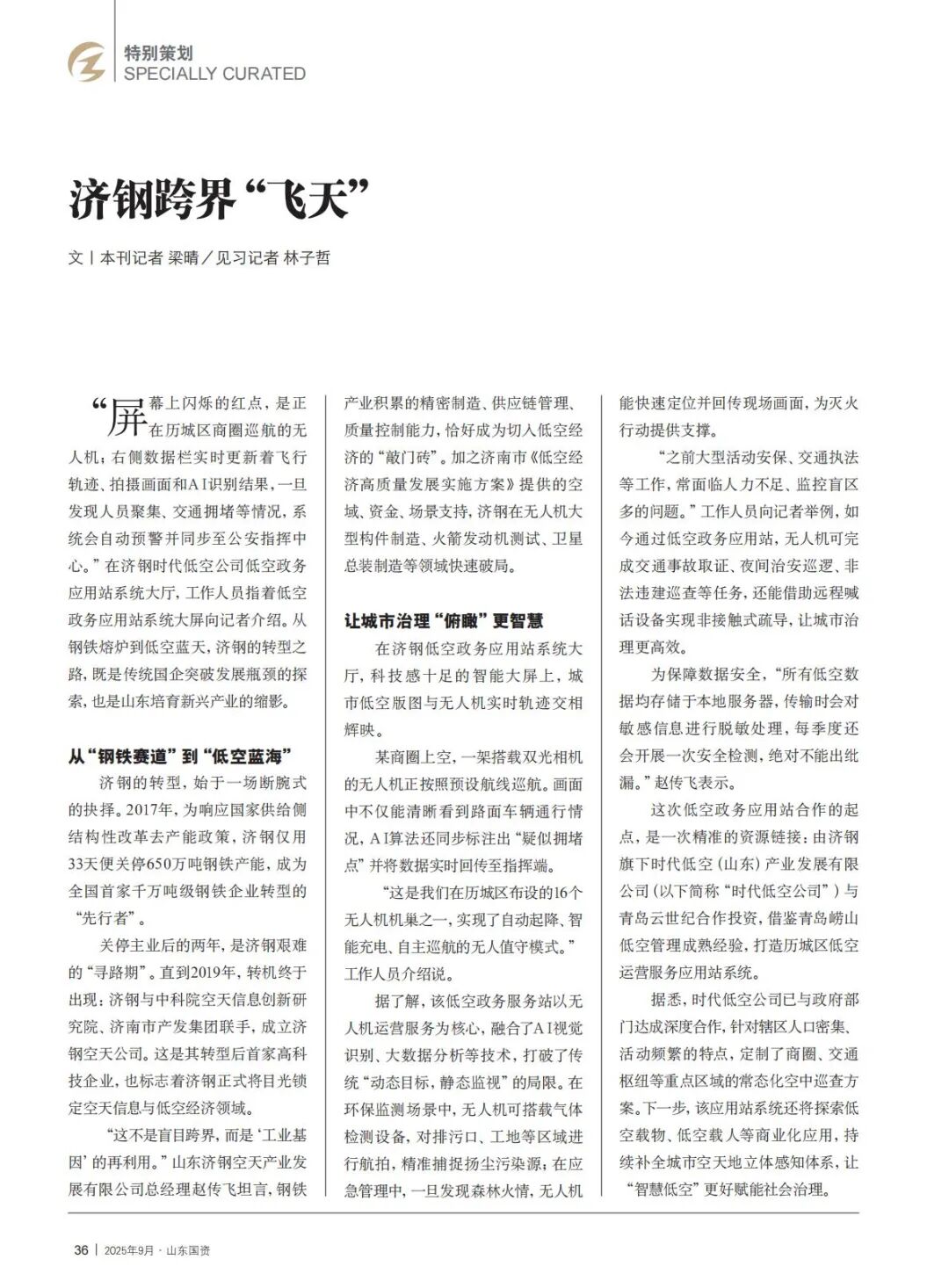 “屏幕上闪烁的红点,是正在历城区商圈巡航的无人机;右侧数据栏实时更新着飞行轨迹、拍摄画面和AI识别结果,一旦发现人员聚集、交通拥堵等情况,系统会自动预警并同步至公安指挥中心。”在济钢时代低空公司低空政务应用站系统大厅,工作人员指着低空政务应用站系统大屏向记者介绍。从钢铁熔炉到低空蓝天,济钢的转型之路,既是传统国企突破发展瓶颈的探索,也是山东培育新兴产业的缩影。