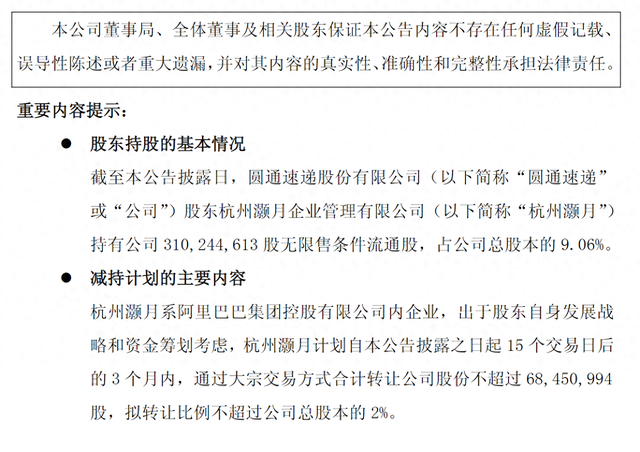 2025年6月,圆通速递发布公告称,宣布阿里旗下杭州灏月在2025年4月3日至2025年6月26日期间,通过大宗交易方式转让公司6893.5万股无限售条件流通股,转让股份数量占公司总股本的2%。