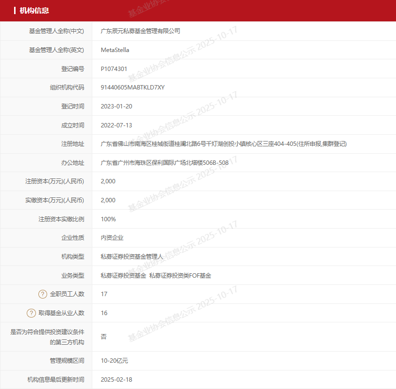 广东辰元私募基金管理有限公司成立于2022年,2023年1月通过协会备案。投资策略主要包括:股票多头策略、复合套利策略和套利对冲策略。