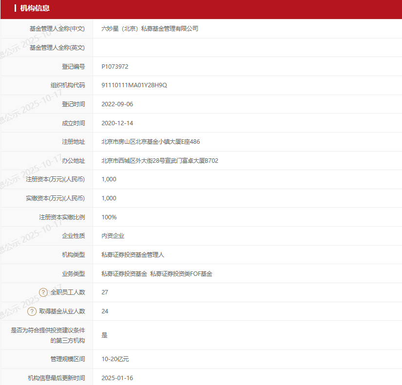 六妙星成立于2020年12月,2022年9月通过协会备案。六妙星创始人姜炯2020年10月-2015年7月曾经供职于北京搜狐,在财经中心担任主编,2015年7月到2017年7月在京东肯特瑞基金运营管理部担任运营负责人。基金经理程舒曾在北京君诺合泰资产、北京泰创投资担任量化投资总监。