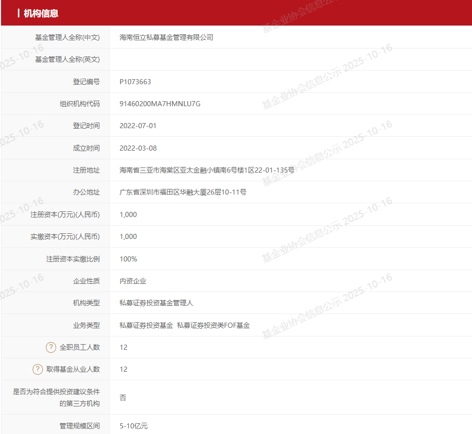 我们首先来看上榜的唯一一家小规模管理人:海南恒立。