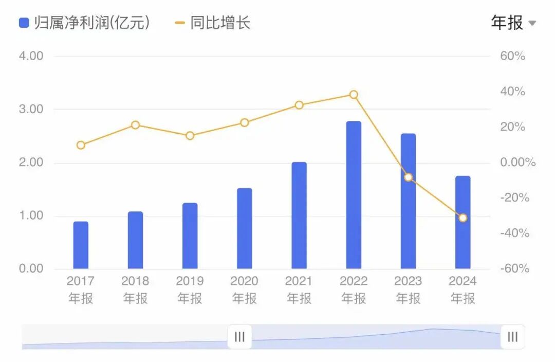 寿仙谷的归母净利润走势与营收高度同步,但盈利能力近期恶化则更为显著。2023年,公司归母净利润首次出现8.39%的负增长,2024年降幅呈断崖式扩大至31.34%。