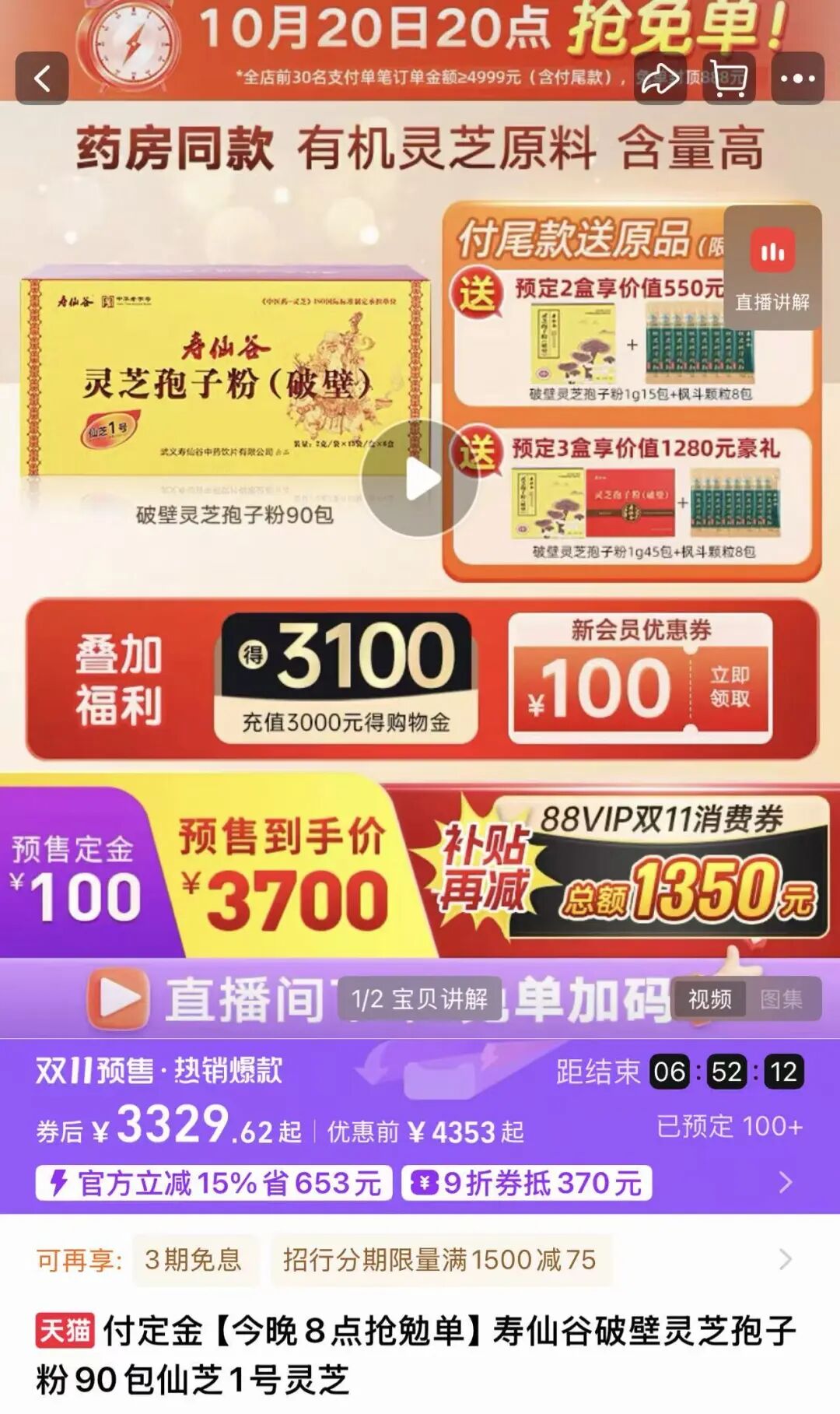 记者查询发现,在“双11”大促来临之际,寿仙谷淘宝官方旗舰店数据显示,优惠后,一盒2g*90包规格的破壁灵芝孢子粉价格仍超3000元。