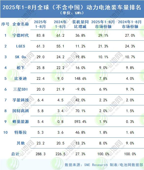 近日,韩国研究机构SNE Research披露2025年1-8月全球(不含中国)的电动车(EV、PHEV、HEV)动力电池装车量数据,达288.3GWh,同比增长27.3%。
