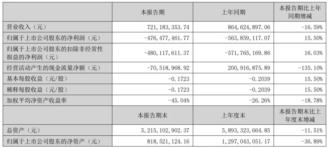 2025年半年报,公司营业收入为7.21亿元,同比下降16.6%;归母净利润自去年同期亏损5.64亿元变为亏损4.76亿元,亏损额有所减少;扣非归母净利润自去年同期亏损5.72亿元变为亏损4.8亿元,亏损额有所减少;经营现金流净额为-7052万元,同比下降135.1%;EPS(全面摊薄)为-0.1723元。