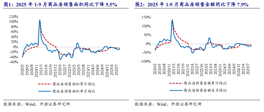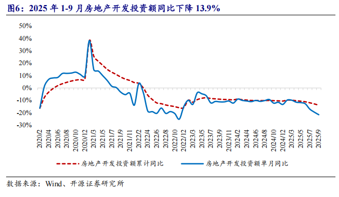2025年1-9月,房地产开发投资额6.77万亿元,同比-13.9%(1-8月-12.9%),其中住宅开发投资额同比-12.9%,降幅持续扩大,新开工数据下滑、三季度以来销售回暖不及预期仍影响投资意愿。