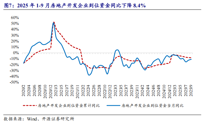 2025年1-9月,房地产开发企业到位资金7.23万亿元,同比-8.4%(1-8月-8.0%),其中国内贷款、自筹资金、定金及预收款、个人按揭贷款累计同比分别-1.4%、-9.3%、-10.3%、-10.6%(1-8月+0.2%、-8.9%、-10.5%、-10.5%),除定金及预收款外其他来源资金同比降幅均扩大或增速转负,在销售数据走弱情况下,房企销售回款压力仍较大。