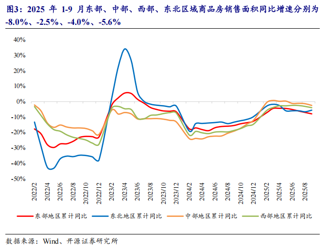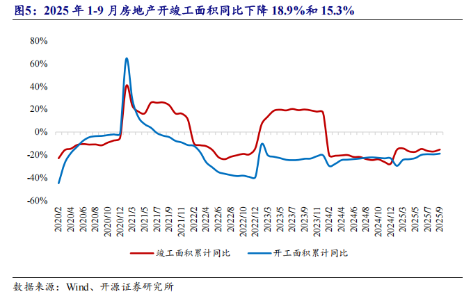 2025年1-9月,全国房屋新开工面积4.54亿平,同比-18.9%(1-8月-19.5%),其中住宅新开工同比-18.3%。我们跟踪的Wind 322城2024年宅地成交面积同比-13%,2025年1-9月同比-9%,拿地减少或将持续影响新开工数据。1-9月,房屋竣工面积3.11亿平,同比-15.3%(1-8月-17.0%),单月竣工面积同比+1.5%,自2023年12月以来首次转正,参考2022-2023年新开工面积超20%的降幅,预计2025年竣工面积将依旧承压下降。
