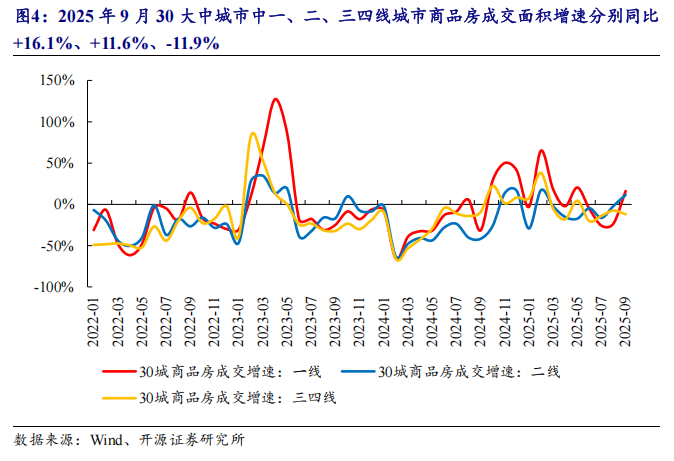 国家统计局发布2025年1-9月商品房投资和销售数据。1-9月,全国商品房销售面积6.58亿平,同比-5.5%(1-8月-4.7%),其中商品住宅销售面积同比-5.6%;1-9月商品房销售额6.30万亿元,同比-7.9%(1-8月-7.3%),其中商品住宅销售额同比下降7.6%。2025年9月,全国商品房销售面积和金额分别同比-10.5%和-11.8%,单月销售数据降幅环比收窄;单月销售均价同比-1.4%,环比-0.9%,以价换量趋势延续,房价企稳任重道远。根据我们跟踪重点城市成交数据,2025年前42周一线、二线和三四线城市新房成交面积增速分别为-0.1%、-5.6%、-8.7%,不同能级城市均进入下跌通道,一线城市成交更加稳健。