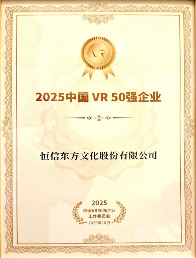 会上重磅揭晓了“2025中国VR50强企业”名单,恒信东方凭借多年在虚拟现实领域的技术积淀,从全国众多优秀企业中脱颖而出,五度蝉联“中国VR50强企业”,其核心竞争力与未来发展潜力获得高度认可。