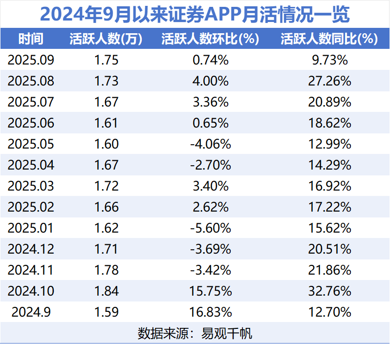 易观千帆数据显示,9月证券类App月活跃用户规模达到1.75亿人,环比增长0.74%,同比增长9.73%,不仅刷新2025年单月最高纪录,更创下“9・24”行情以来第三高位。