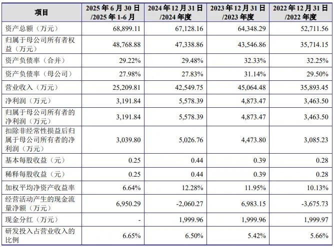 报告期内,公司实现营业收入分别为3.59亿元、4.51亿元、4.25亿元、2.52亿元;同期实现扣非归母净利润分别为3085.23万元、4473.80万元、5026.76万元、3039.80万元。