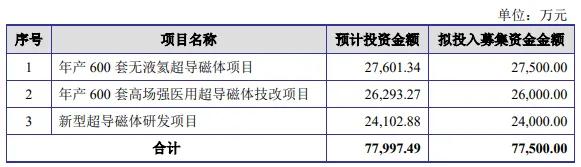 此次IPO拟募集7.75亿元,用于年产600套无液氦超导磁体项目、年产600套高场强医用超导磁体技改项目、新型超导磁体研发项目。