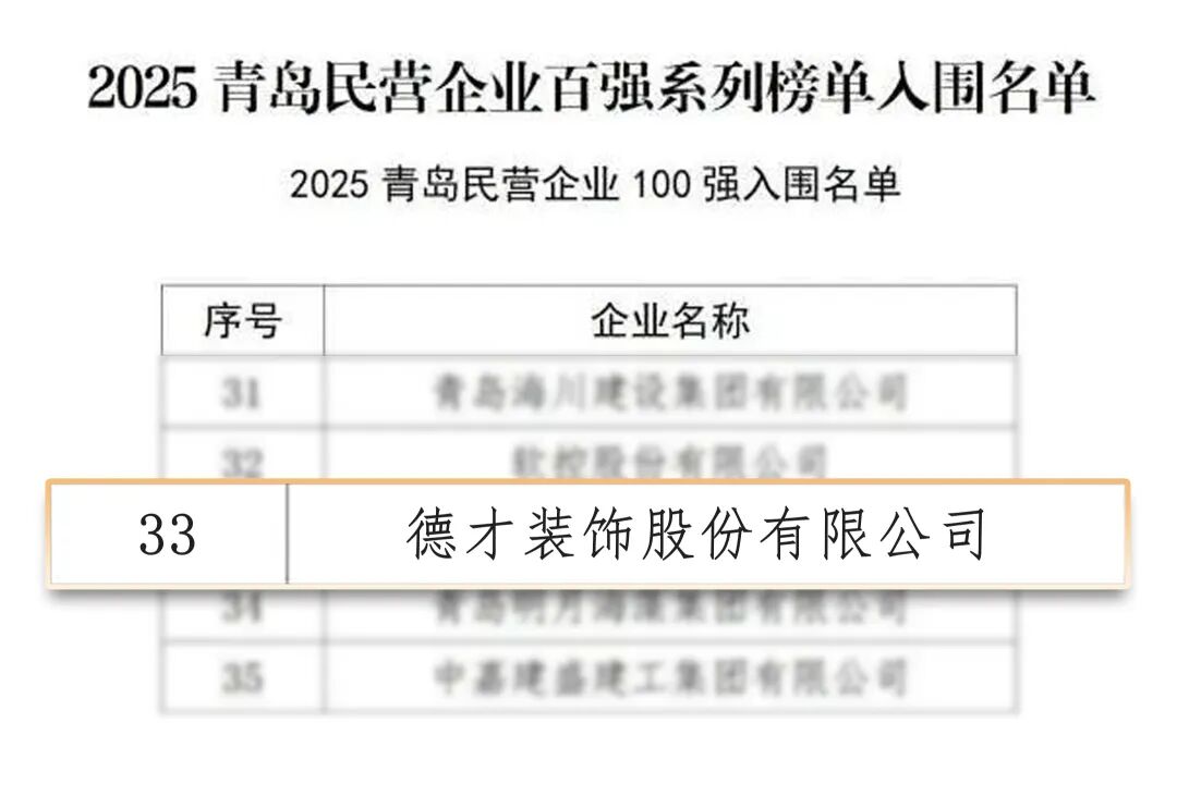 近日,由青岛市工商联、市发展改革委、市科技局、市工业和信息化局、市人力资源和社会保障局、市农业农村局、市商务局、市市场监管局、市民营经济局、市税务局共同组织开展评选的2025青岛民营企业百强系列榜单发布 ,德才股份成功登榜,这是公司继荣登“2025山东民营企业200强”后获得的又一重要殊荣。