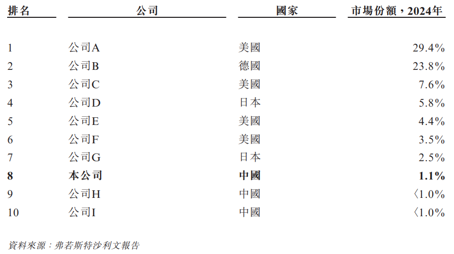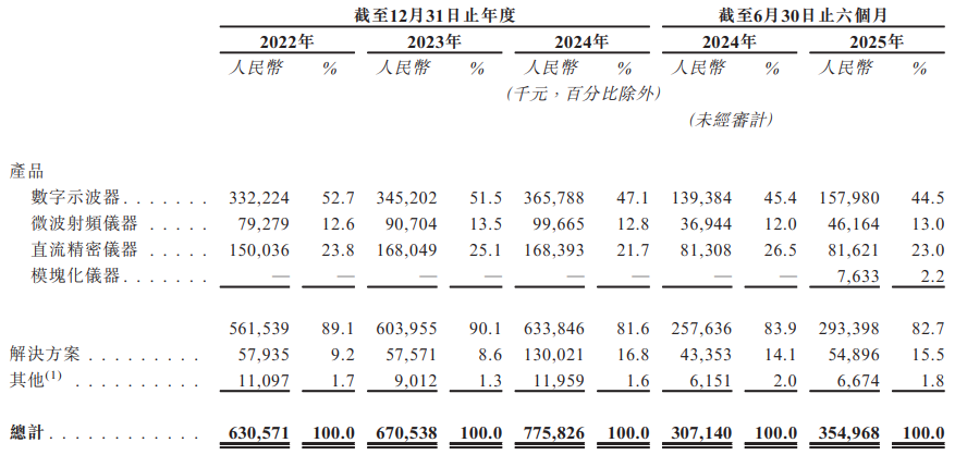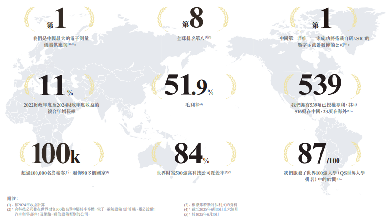 2024年,其中公司成为全球电子测量仪器市场排名最高的中国企业。按2024年收益计,公司是中国最大的数字示波器供货商,在全球排名第五;公司是中国最大的波形发生器供货商,在全球排名第三;公司是中国第一且唯一一家成功将搭载自研专用集成电路(「ASIC」)的数字示波器商用化的公司。