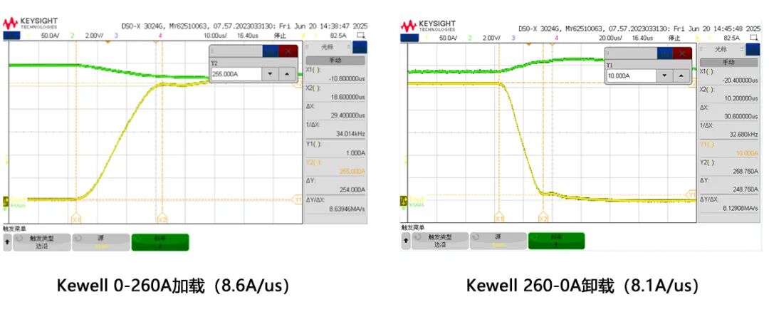 服务器电源动态响应测试中有着高速动态拉载的硬性要求,根据标准单PSU测试电流斜率需≥2.5A/us,E5100系列可编程直流电子负载某客户现场实测电流斜率数据如下图,系列机型最大斜率可至80A/us。